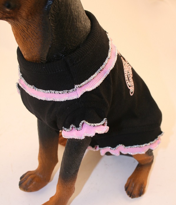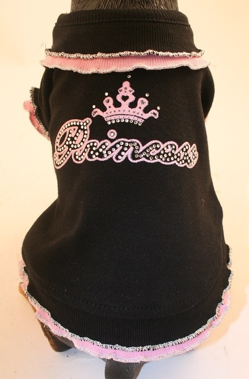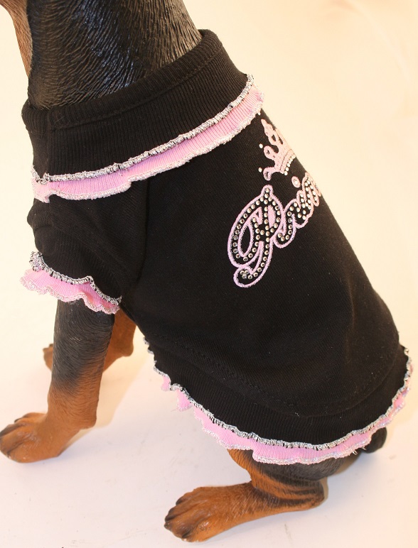 This is a very special dress made of 100% black rib cotton with, double ruffles at the collar, cap sleeves and bottom line. The pink trim line at the ruffles and the silver thread tipping on all ruffles adds to the style of this unique dress. Top it off with the very detailed beads and rhinestones lettering showing “Princess” in very glamorous style.