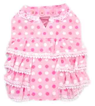 This cute little dress is 100% cotton, and hand washable, it has multiple layers of fringed skirts with lace trimming. It it attached on the back with three buttons, two allowing for additional sizing if necessary. Cool and casual, your pup will love the feel and comfortable fit of this dress. Stylish frill dress from Puppe Love.