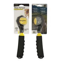 With the Huck 'N Tuck, we made the ball thrower you've always wanted. With unmatched quality you can feel, the durable handle stands up to powerful throws, while its unique design allows the handle to collapse from 24" down to 12", making it compact enough to fit in a pocket or drawer. To keep your hands free (as well as slobber free), the Huck 'N Tuck stores the included ball or any standard-sized tennis ball whether the handle is extended or collapsed.