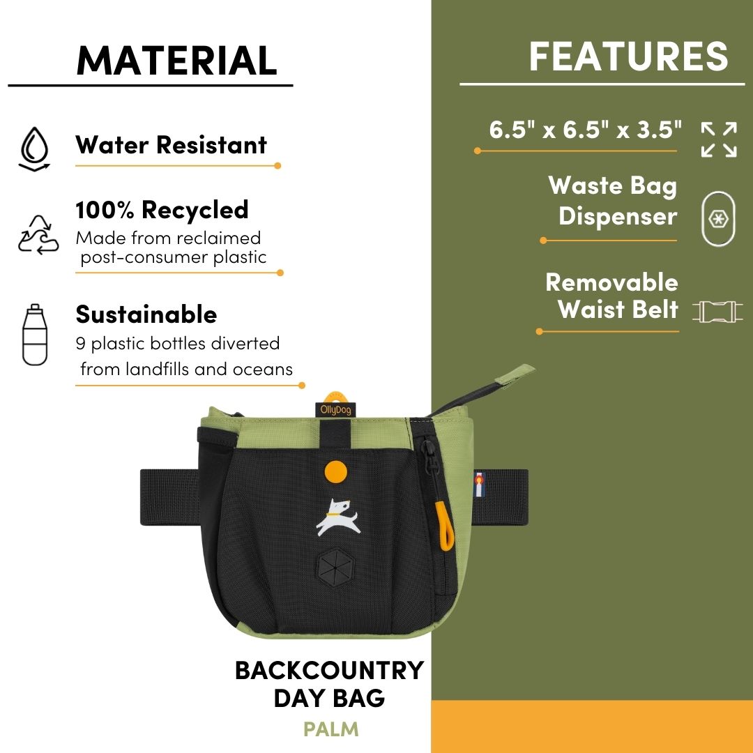 With space for waste bags, dog treats, and your phone (to snap cute candid moments), the Backcountry Day Bag offers hands-free training with quick access to everything you need. Featuring water-resistant fabric made from recycled materials, a zipper closure, a dog poop bag holder, and a roomy interior, the Backcountry Day Bag can be clipped or worn around the waist with ease. Perfect for dog training!