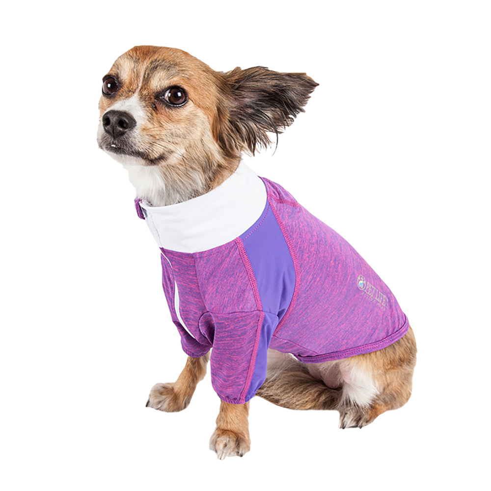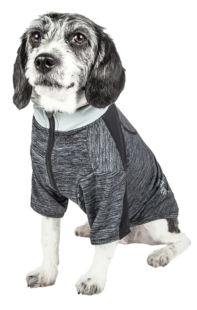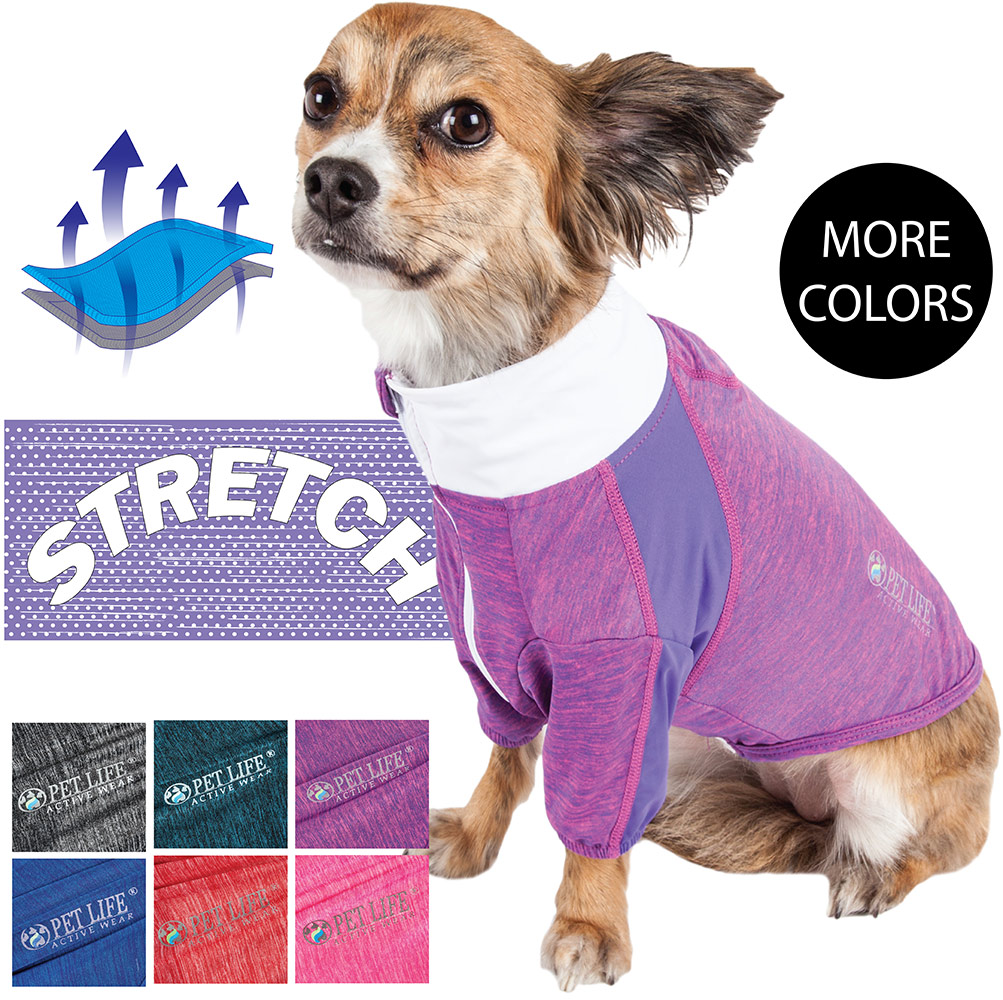 The Pet Life® ACTIVE 'Chewitt Wagassy' Heathered Triple-Toned Long Sleeve Performance T-shirt features specially engineered Stretchy fabric that are Lightweight and Permeable resulting in a well Ventilated system that is specially developed to maximize Mobility and Breathability. Features 4-Way Stretch Technology that moves better in every direction with a customized relaxed fit without the squeeze and won't bunch up. The side of the body and arms feature a lighter blend of fabric for strategic ventilation. Features Quick-Drying properties that dries extremely fast while offering Anti-Odor technology that prevents odor causing microbes. The Chewitt-Wagassy Long Sleeve T-shirt is also UV Protectant against the suns harmful rays and fitted perfectly to help assist in containment or collection of shedded hairs. Design features Dual Reinforced stitching at every seam for durability with a convenient zippered design with protective zipper flaps preventing the pet's hairs from getting caught within the zipper tracks. Additionally this T features Reflective Taping for added night visibility and a Leash Slit along the back. Macine Washable. This style is part of our Pet Life® Activewear Collection. Available in Multiple Sizes and Colors. SIZING SPECIFICATIONS: EXTRA SMALL: Back: 9.5" Chest: 13.5" Neck: 12.5" Sleeve: 4.5" SMALL: Back: 11.5" Chest: 16.5" Neck: 13.5" Sleeve: 5 MEDIUM: Back: 15" Chest: 20.5" Neck: 15.5" Sleeves: 5.5" LARGE: Back: 18.9" Chest: 25.5" Neck: 17.3" Sleeve: 6.1" EXTRA LARGE: Back: 22" Chest: 30.5" Neck: 19.8" Sleeve: 7"