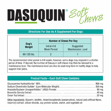 asuquin Soft Chews for Large Dogs is a comprehensive joint health supplement for dogs. Dasuquin's enhanced formula features the same effective ingredients as Cosequin with the enhanced effects of ASU.