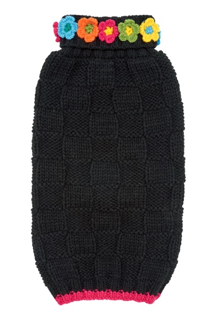 Our Floral Basketweave Sweater is hand knitted with a beautiful basketweave pattern. Knitted flowers surround the turtleneck. Perfect for a little extra warmth on cool days, or layered under our coats during chilly winters.