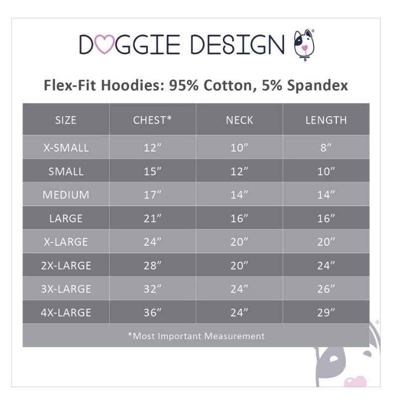 Your pup will love the comfort and style of this Doggie Design wardrobe essential. With the flexible fabric and ribbed trim, even hard-to-fit dogs will love the style of this pullover hoodie. We have used human-grade high-quality thicker material (290 GSM - gram per square meter) that is not usually seen in pet sweatshirts. This makes our dog hoodies the perfect choice for colder climates with the thick, plush material. The leash access hole at the base of the hood makes walks a breeze for dogs that prefer their hoods worn up or for pups that use a harness.