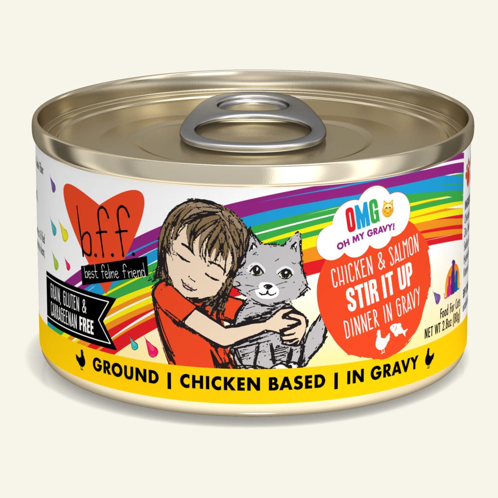 Stir up your kitty’s taste buds with this tasty, chicken-based meal! The chicken and salmon dinner in gravy will leave your kitty meowing for more!