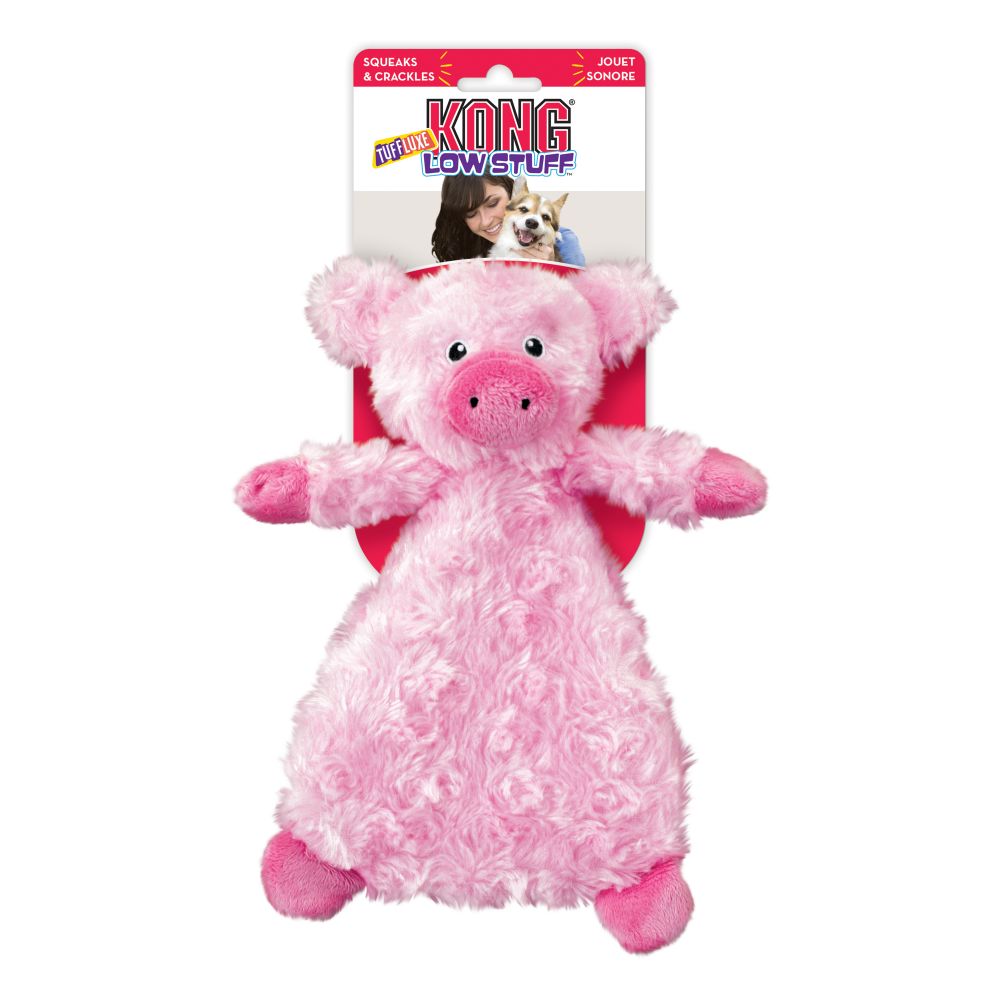 KONG’s Low Stuff Tuffluxe pig entices a dog’s natural instincts with a soft textured exterior and an extra interior layer the combine to make this plush toy last longer. This unique interior has the added benefit of satisfying natural chewing instincts. The elongated flat shape makes it ideal for shaking and thrashing fun while the crinkle and squeak sounds add to the engagement. Having less stuffing for less mess makes this toy ideal for indoor playtime.