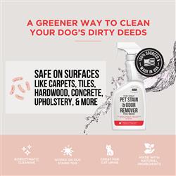 It’s not all whiskers & wagging tails. We know that new pets, aging ones, and all stages between can get messy. Fear not! Our hero doesn’t wear a mask, nor do any masking of any sort. Instead, our Pet Stain & Odor Remover uses enzymes to completely eliminate odors and any organic offenders (a nice way of saying blood, urine, feces and vomit) that get in its way. We know there are a lot of Pet Cleaners out there but what truly makes our Pet Stain & Odor Remover different is this: when nature calls we summon grime & odor lovin’ bacteria to get the job done— saving rugs, floors, grout, and even sofas from offensive smells & stains. That means no harsh chemicals near your pets, kids or pet-kids. Not all heroes wear capes, but if they did, they would clean it with this stuff! White carpet tested; red carpet approved.