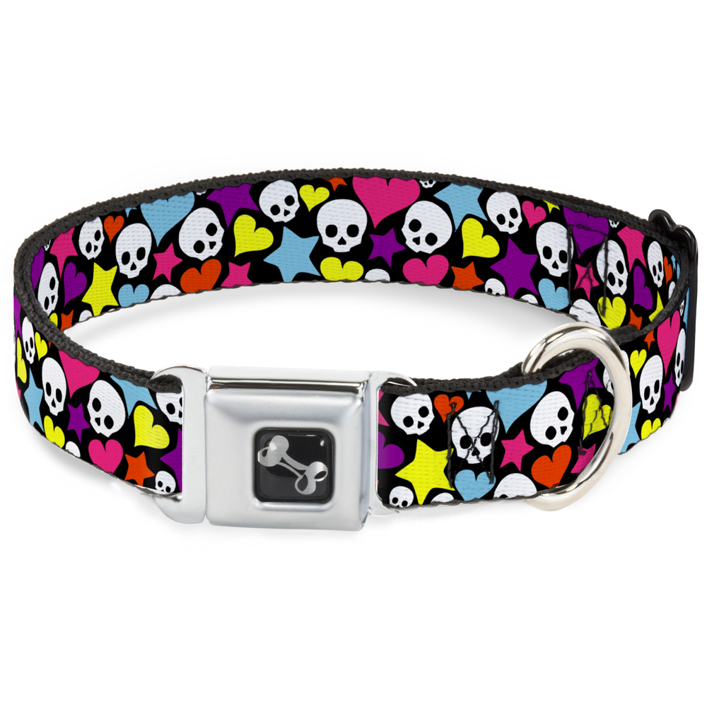 Dog Bone Black/Silver Seatbelt Buckle Collar - Funky Skulls Hearts & Stars Black/Multi Color