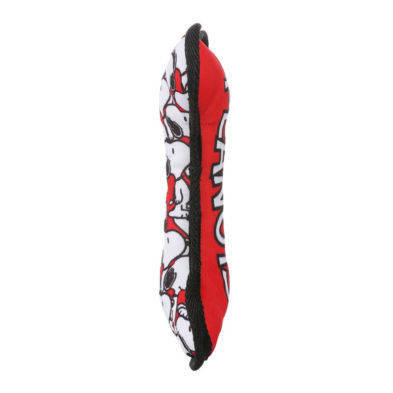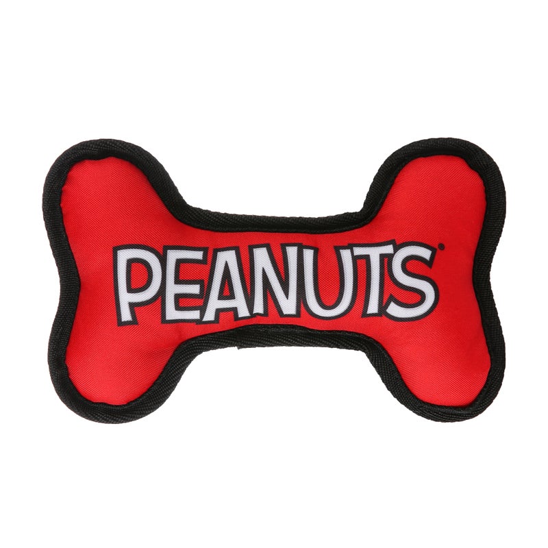 The Peanuts Snoopy Oxford Bone Dog Toy is just what your dog needs to make play time the most fun it has ever been. Designed with the shape of a dog bone and featuring a repeating Snoopy print, this canvas dog chew toy brings hours of endless entertainment to your pet. This fun and light dog toy is great for all dogs to add to their dog toy bin or dog toy box but it is especially great for those with owners who love the Charlie Brown series and Snoopy. The front of this dog bone chew toy has a repeating Snoopy print and the back of this red dog chew toy has the word PEANUTS prominently displayed. This is the perfect dog toy for medium dogs, large dog toys, and small dog toys. Canvas chew dog toys like this one also work well as Snoopy gifts! There's nothing better than the classics, and that is exactly what you will get with this officially licensed Peanuts Snoopy chew dog toy.