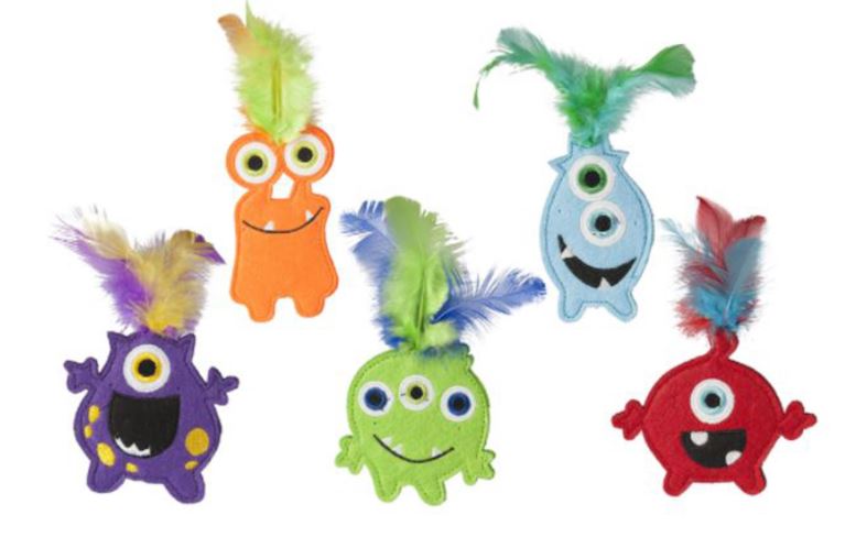 These Monsters are colorful, whimsical, cat toys that contain catnip. Each Monster had multiple feathers to attract and entice play. Available in a variety of characters and colors.