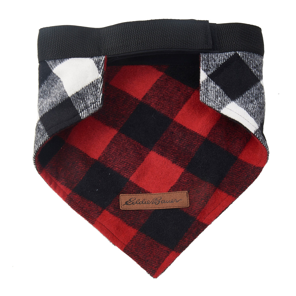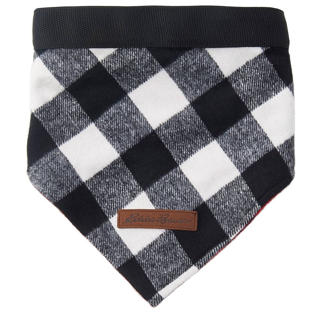 Reversible fashionable buffalo check bandana. Red/ Black buffalo check sporty bandana reverses to white/ black buffalo check. Faux suede Eddie Bauer label on both sides. Adjustable hook and loop closure at the neck. 100% Polyester. Machine wash cold, tumble dry low or hang dry. Red/Black, White/ Black. S/M (19 inches) L/XL (25 inch). Comes in packs of 6.