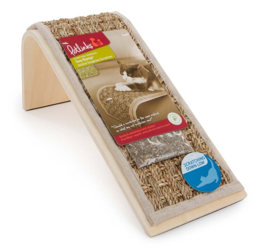 The instinct to scratch is hard-wired into cats, they scratch to mark territory and promote healthy nail growth as well as stretch and tone muscles and even alleviate stress. Petlinks Sea Ramp seagrass scratcher ramp offers a sturdy scratch surface of satisfying seagrass and comes with a bag of Pure Bliss Catnip to attract your kitty. Most cats respond to catnip with a burst of energetic activity followed by a purrfectly calm mellow period. Our catnip is produced without chemicals or pesticides and is grown on our own catnip farms. Seagrass offers a favorite and sturdy texture that cats love to sink their claws into and provides an excellent solution to deter cats from scratching furniture.