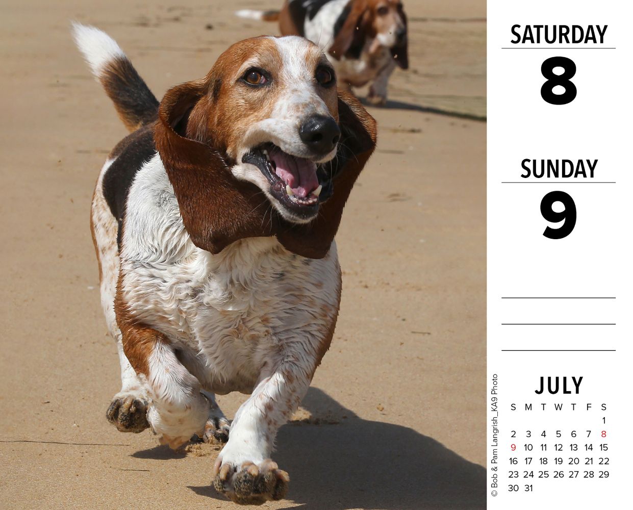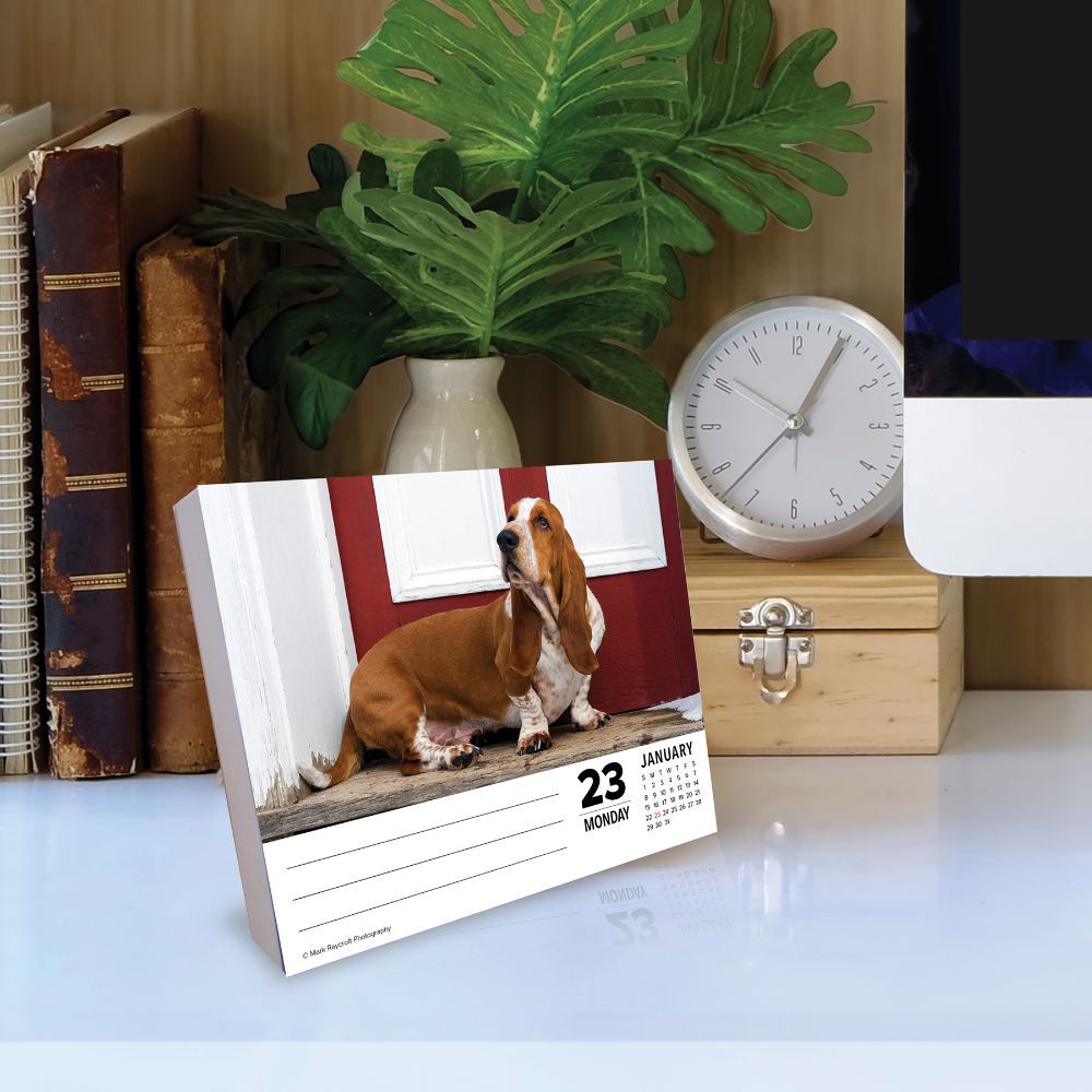 Basset Hounds may appear a bit curious to some folks, but to their fan base they are absolutely the cutest dogs in the world! Enjoy a full-color, year-long tribute to the sweet and endearing Basset Hound with this colorful daily calendar! Over 310 full-color photographs typify all their gentle charms and sweet dispositions. Full-color images on easy tear-off pages are printed on high quality, FSC certified paper with soy-based inks. Pages are mounted on a 5.25”x 6” recyclable plastic stand for easy display. All major public and culturally significant holidays are included.