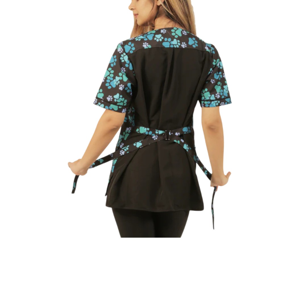 Ladybird Line’s blue pawprint grooming jacket, a functional, fashionable jacket for any groomer