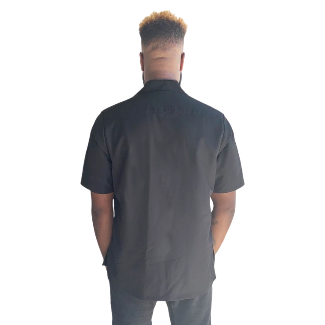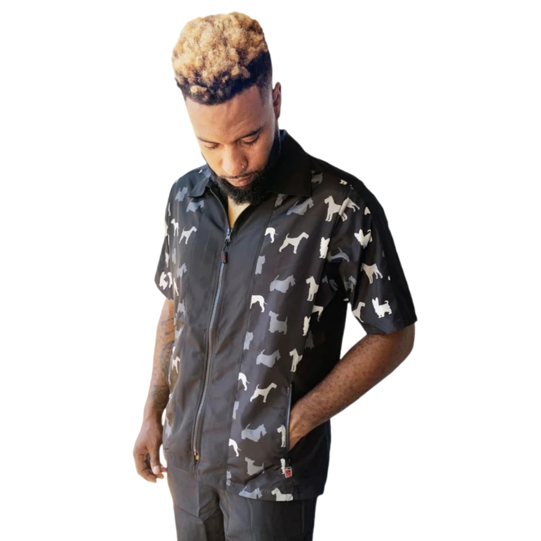 Ladybird Line’s men’s terrier print grooming jacket, a functional, fashionable jacket for any groomer