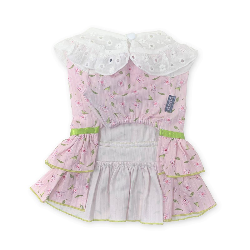 Cute fabric with all-over small floral patterns and eyelet collar. Double layered designed skirt. Leash hole available below collar.