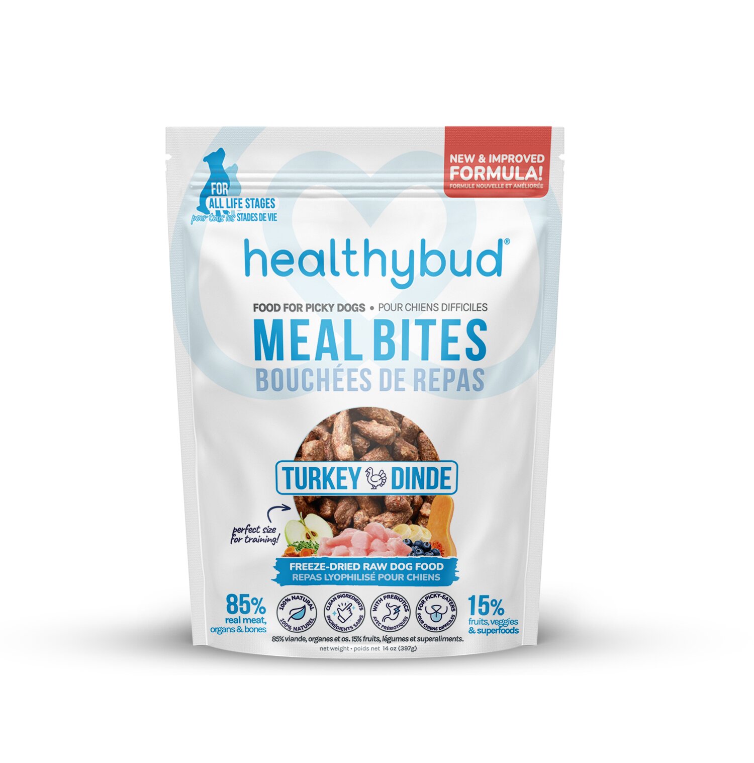 Healthybud’s Turkey Meal Bites deliver the benefits of raw with the convenience of kibble. The first freeze-dried food to include pre+postbiotics for better digestion, they’re made with 85% meat, organs & bone and 15% fruits, veggies superfoods. Complete & balanced to exceed AAFCO standards, these nutrient-rich bites are crafted for picky eaters and work as a full meal, topper, or high-value training food.