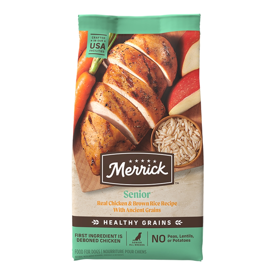 Give your older pooch a delicious and nutritious meal with Merrick Healthy Grains Senior Recipe Dry Dog Food. This dry dog food is made with deboned chicken as its main ingredient, which helps build and retain healthy muscle tissue. Its drool-worthy chicken flavor is complemented by healthy grains such as brown rice, oatmeal, barley, and quinoa to support your canine companion's digestive health.