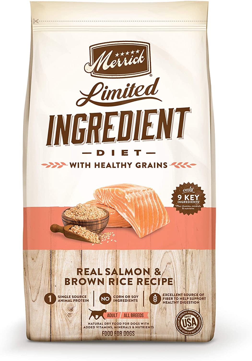 Merrick Limited Ingredient Diet Real Salmon & Brown Rice Recipe Dry Dog Food is specially formulated with a limited number of carefully selected ingredients to provide complete and balanced nutrition for dogs with food sensitivities and sensitive stomachs. Real deboned salmon is always the first ingredient. This single-source real deboned protein provides important amino acids, vitamins and minerals. This recipe contains leading levels of Omega-6 and Omega-3 fatty acids to aid in a healthy skin and coat and leading levels of glucosamine and chondroitin for healthy hips and joints. Merrick Limited Ingredient Diet Real Salmon & Brown Rice Recipe is made with only 9 key ingredients. All Merrick recipes are crafted in our Hereford, TX kitchen and cooked in the USA, in facilities that uphold strict FDA guidelines.