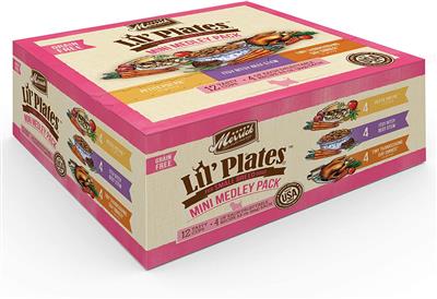 Power up your lil' pup with the Merrick Lil'Plates Mini Medley Wet Dog Food Variety Pack. This variety of delicious wet food for small dogs features Petite Pot Pie, Itsy Bitsy Beef Stew and Tiny Thanksgiving Day Dinner. Each flavor is made with meaty chunks of real deboned beef, chicken or turkey as the very first ingredient. This variety pack of wet dog food is specially formulated for small breeds of dogs in any stage of life and packaged in a convenient easy-to-open single-serve tray. Each flavor is made using natural ingredients without any grains or gluten for the benefit of your little guy. Variety pack of 12 easy-to-open 3.5-ounce single-serve trays. Features Petite Pot Pie, Itsy Bitsy Beef Stew and Tiny Thanksgiving Day Dinner. Includes meaty chunks of real deboned beef, chicken or turkey as the very first ingredient. Specially formulated for small breeds and made using natural ingredients without any grains or gluten. Crafted in Hereford, TX and cooked in the USA.