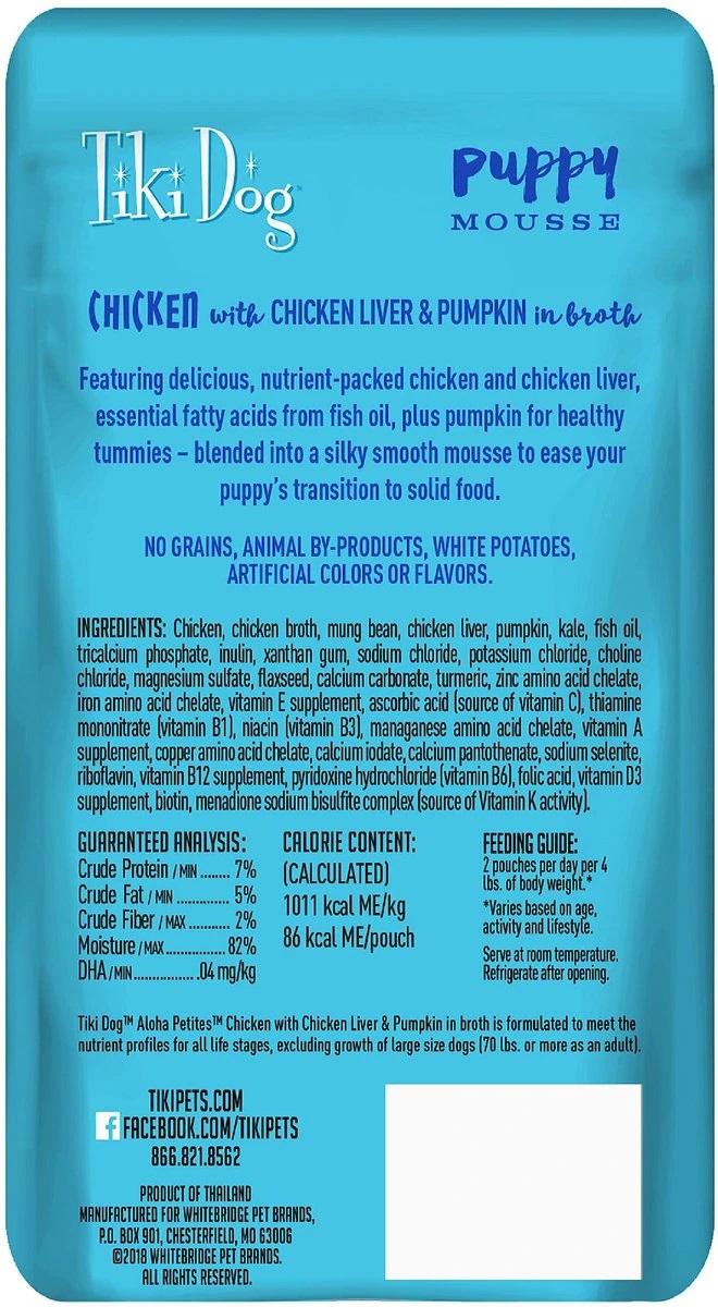 Help your pup level up with Tiki Dog Aloha Petites Puppy Mousse Chicken & Pumpkin in Broth Small Breed Grain-Free Wet Dog Food. This grain-free, wet dog food for small-breed puppies is crafted into a silky smooth mousse to help your lil’ guy transition to solid food. It features high-quality, protein-packed chicken and tasty chicken liver to create a flavor he can savor. This wet dog food is made with nutrient-rich superfoods such as flaxseed, kale and essential fatty acids from fish oil. It is designed for digestibility with pumpkin for a healthy tummy, while DHA helps support healthy brain and eye development.