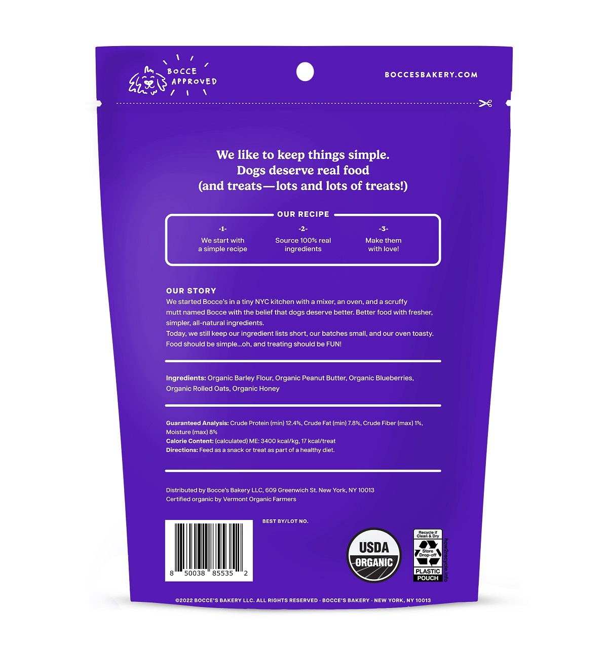 Made with organic, vegetarian, allergy-friendly, ingredients (blueberries, peanut butter & honey!) and packaged in recyclable bags this is what treating was meant to be.