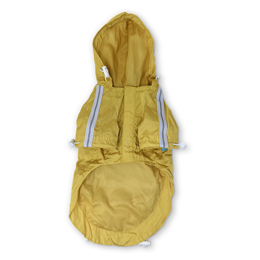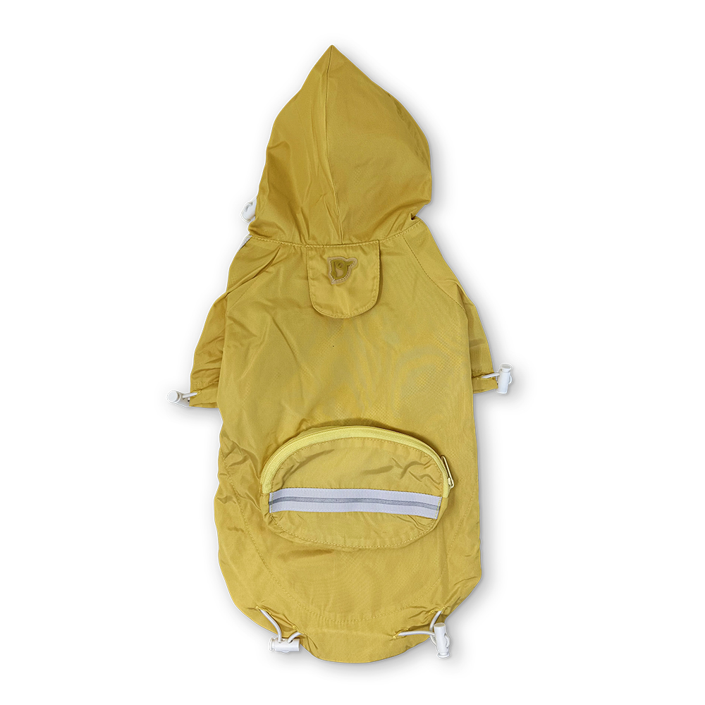 Raincoat with Shoulder and Chest Coverage. This stylish yet practical raincoat is designed for simplicity and convenience. Featuring a Velcro closure and leash hole, it's effortless to put on and take off, making it perfect for unexpected showers. The fold-in-pouch design ensures compact and effortless portability.