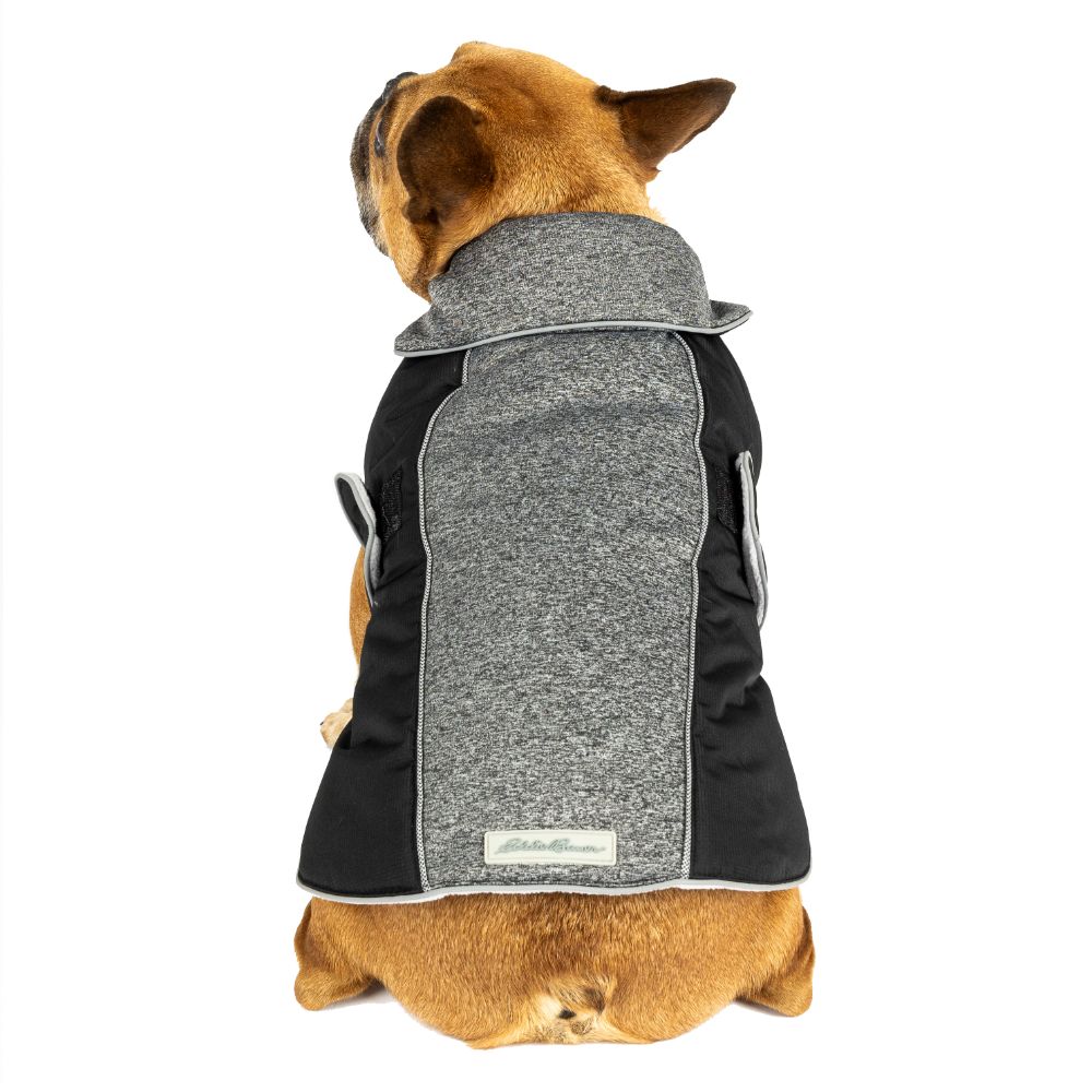 Two-Tone activewear coat with carbon nylon colorblocking on the sides and gray polyester colorblock down the back. The thin fleece lining is designed for comfort and to be breathable. Features leash opening, reflective trim, hook and loop straps on the sides. This coat offers full chest coverage. Gray rubber Eddie Bauer patch. Machine wash cold, tumble dry low or hang dry. Carbon/Gray, S-XL
