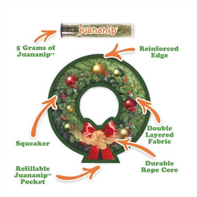 Juananip has a calming effect on dogs. It relaxes them to a place of peace and tranquility they all crave. Enjoy some right now with our new Tuffer Chewer Mini Refillable Holiday Wreath Toy. The extra durable fabric, double stitched edging, and rope throughout make it perfect for dogs who love to play rough. Stuff a pinch of Juananip into the pouch for a healthy play session that will help leave your dog dog-tired, easing them into doggi-vana.