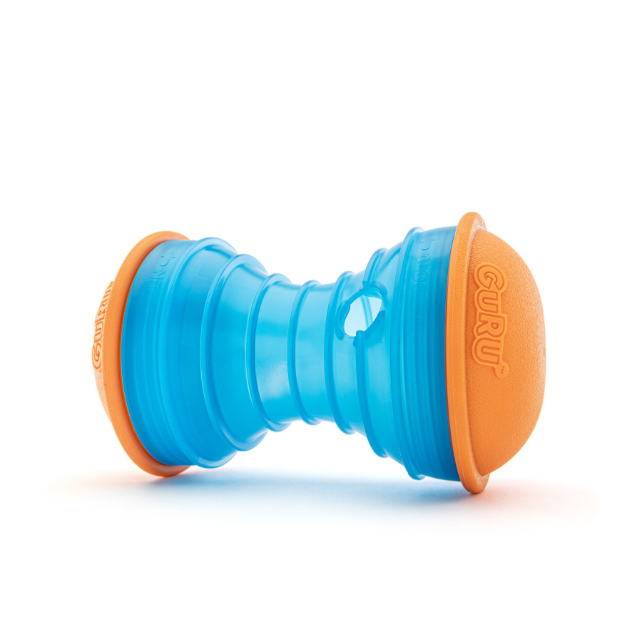 Roll, bounce, tumble, spin, solve, and feed. The Bouncer does it all! GURU created the Bouncer to keep dogs challenged and engaged through intentional multi-functional play. It tumbles, bounces and squeaks to keep dogs entertained for hours! Use as a full meal feeder or for treat play, the Bouncer holds over two cups of kibble that slowly dispenses through opposing holes on the center barrel as it tumbles and bounces.