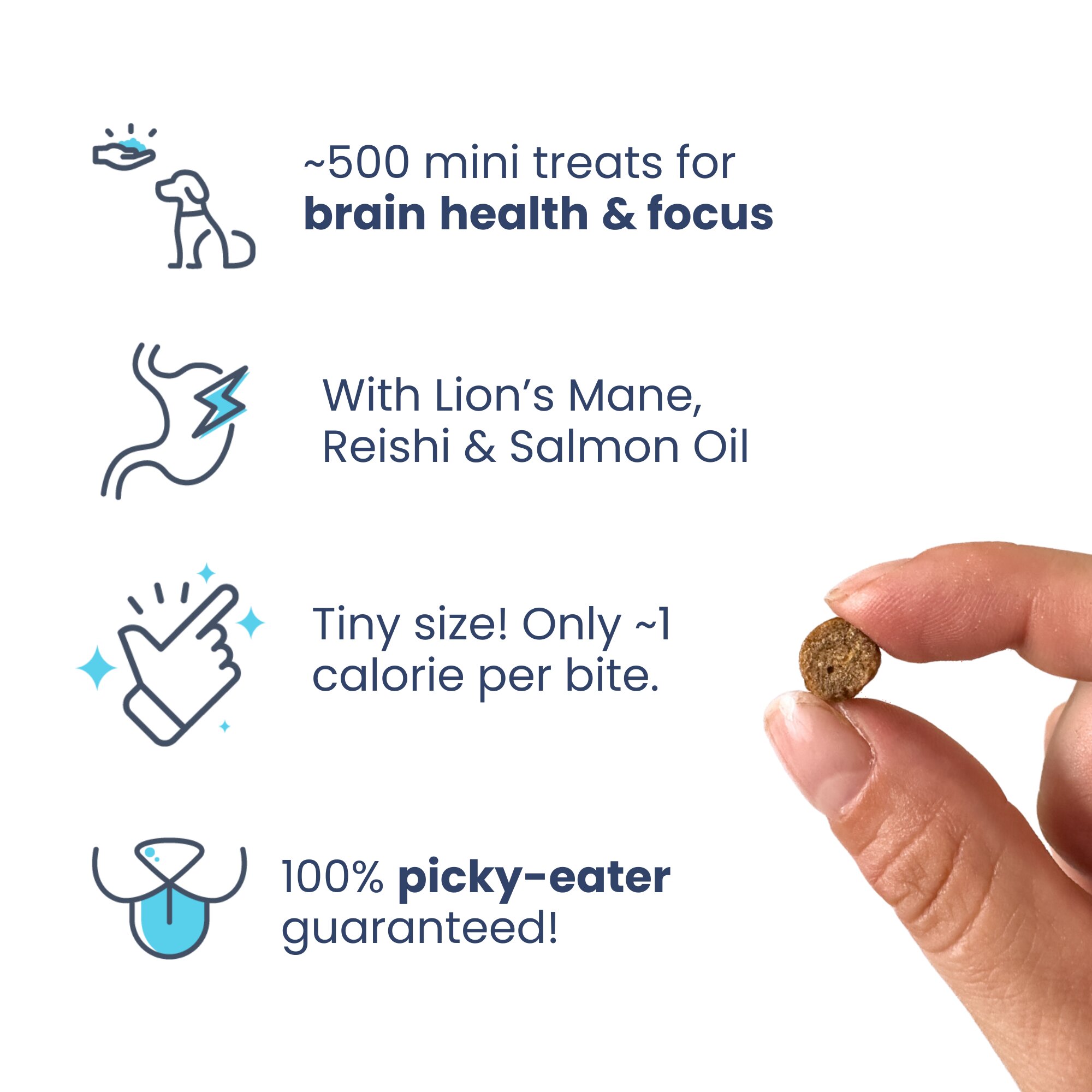The first functional mini training treat for dogs! Packed with Lion's Mane, Reishi & Salmon Oil for brain-boosting benefits.