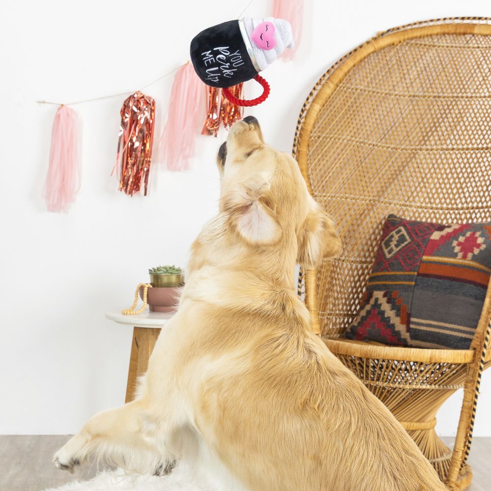 Where have you bean all my life? PetShop by Fringe Studio's “You Perk Me Up” plush toy is perfect for playtime, anytime. Made with a super loud squeaker, crazy crinkle paper, and tuggable rope, your pup will like it a latte. Great for all-sized dogs and not intended for aggressive chewers.