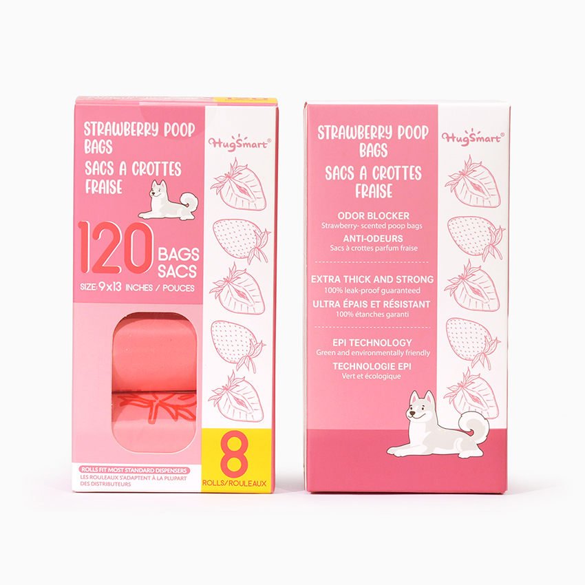 Keep your poop pickups sweet and pleasant with our strawberry-scented bags. Designed to fit most standard bag dispensers, you can choose from two package options: 120-count (8 rolls with 15 bags per roll) or 240-count (16 rolls with 15 bags per roll). Each leak-proof bag is large enough for easy handling and mess-free cleanup.