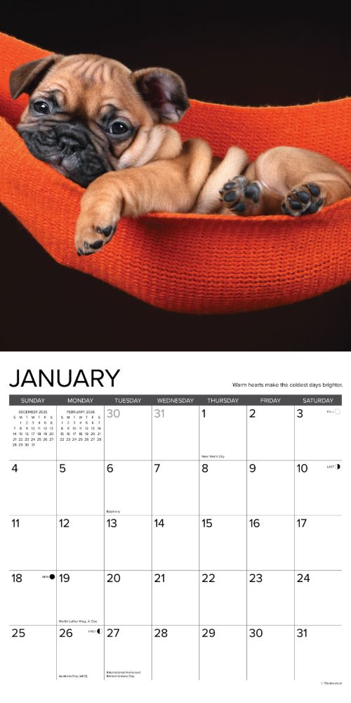 Those who have raised puppies know they have lessons to teach: smile more; play hard; sleep soundly; love without inhibition. These lessons and more are demonstrated in twelve charming full color photos and accompanying text. Stay organized in the upcoming year with a Willow Creek Press 2026 12" x 12" Wall Calendar. This calendar features large grids for easy notation of dates and events, helping you stay efficient and on top of your commitments. Let this calendar guide you to a more organized, successful and fulfilled year ahead. PERFECT GIFT - Look no further for the perfect gift for any special occasion. Make someone's year extra special with one of our 2026 Wall Calendars. Our calendars are the perfect choice for your friends or family, even for those difficult to buy for PLANNING - Stay organized and inspired throughout the year. Ideal calendar for taking notes, recording dates to remember, tracking appointments and assisting in family activity organization INCREDIBLE IMAGES – Crisp, detailed full-color images every month providing Wall art for Home, Office or School LARGE GRIDS – 12” x 12” format, with large daily blocks providing ample writing room SUPERIOR QUALITY – High quality paper stock that lays flat when hanging and offers crisp, bright colors MONTHLY OVERVIEW – Plan ahead or look back with grids of the upcoming and previous months at a glance ECO FRIENDLY – Willow Creek Press is committed to eco-friendly efforts to make our products more sustainable, our 2026 12" x 12" wall calendars are printed with soy-based inks on high-quality FSC certified paper for smooth writing DATE RANGE - 2026 Wall Calendar with 6 bonus months from July-December 2025 BONUS FEATURES –US and International holidays and moon phases (CST) noted on each month for easy tracking This year can be your most successful yet, with this beautiful and brilliant wall calendar. Learn how to become a highly effective person, one month at a time!