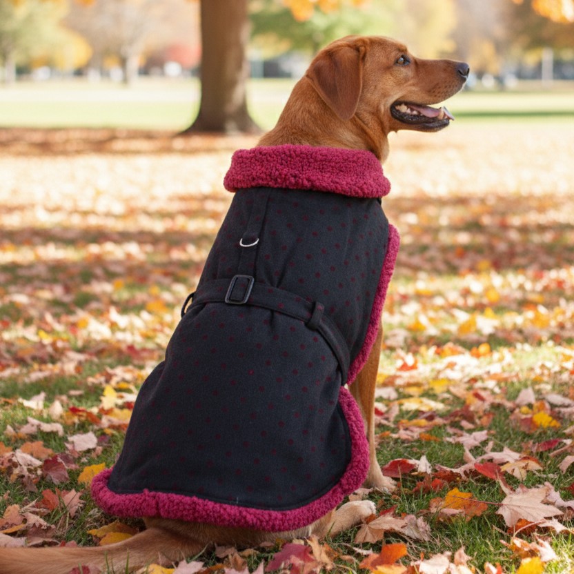 Black wool and burgundy dots with thick, warm and soft fleece fur collar and lining. This coat features touch fastener neck and chest closures. It includes a matching leash and a D-ring for easy leash attachment. Made with high-quality cotton/polyblend outer. We've continued the quality with double box stitch reinforced D-ring attachments.