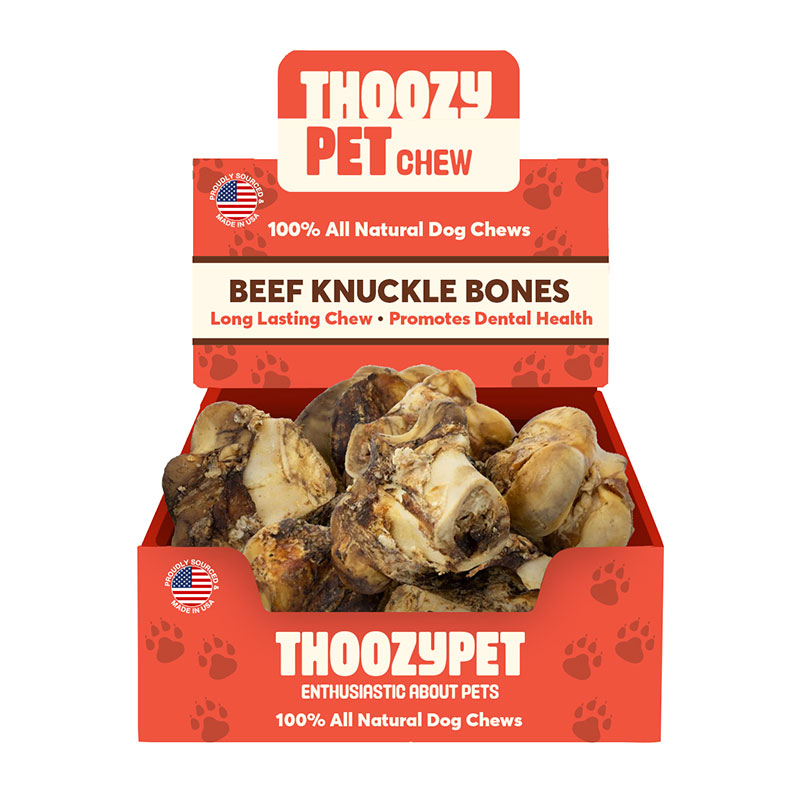ThoozyPet USA-Sourced Beef Knuckle Dog Chews are the perfect beefy treat for medium and large breed dogs, especially aggressive chewers. These extra-long-lasting, durable chews are made from 100% beef bone, with the original meaty morsels still attached, encouraging chewing and providing a natural flossing action for your dog’s teeth. The tough texture gives your dog a satisfying dental workout, helping to remove plaque and tartar while massaging gums for better oral health. Not only do these chews promote healthy teeth and gums, but they also help fight boredom, relieve stress, and offer hours of chewy fun. A premium, all-natural treat for your pup to enjoy!