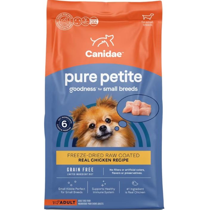 Canidae PURE Petite Grain Free Limited Ingredient Dry Dog Food for small Breeds offers your small dog a well-rounded meal that's crafted with their health and well-being in mind. Your pup will love the smalll kibble size made just for them and the enjoy the added taste from the freeze dried raw coating. Just like your furry friend, this kibble packs a lot of punch with more nutrients per cup than other leading brands.