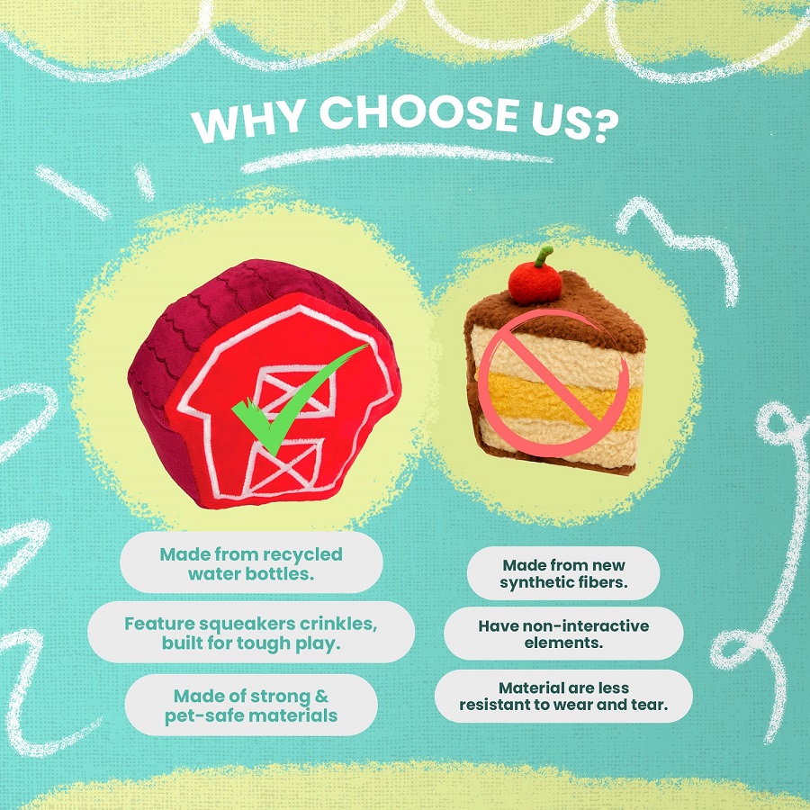 This adorable, barn-shaped plush toy is perfect for fetch, tug, or cuddles. Crafted from soft yet durable fabric, it features embroidered barn door details and a vibrant red and maroon color scheme that’s sure to stand out in your dog’s toy box. With a built-in squeaker to keep tails wagging, The Barn offers hours of farm-fresh entertainment for dogs of all sizes.