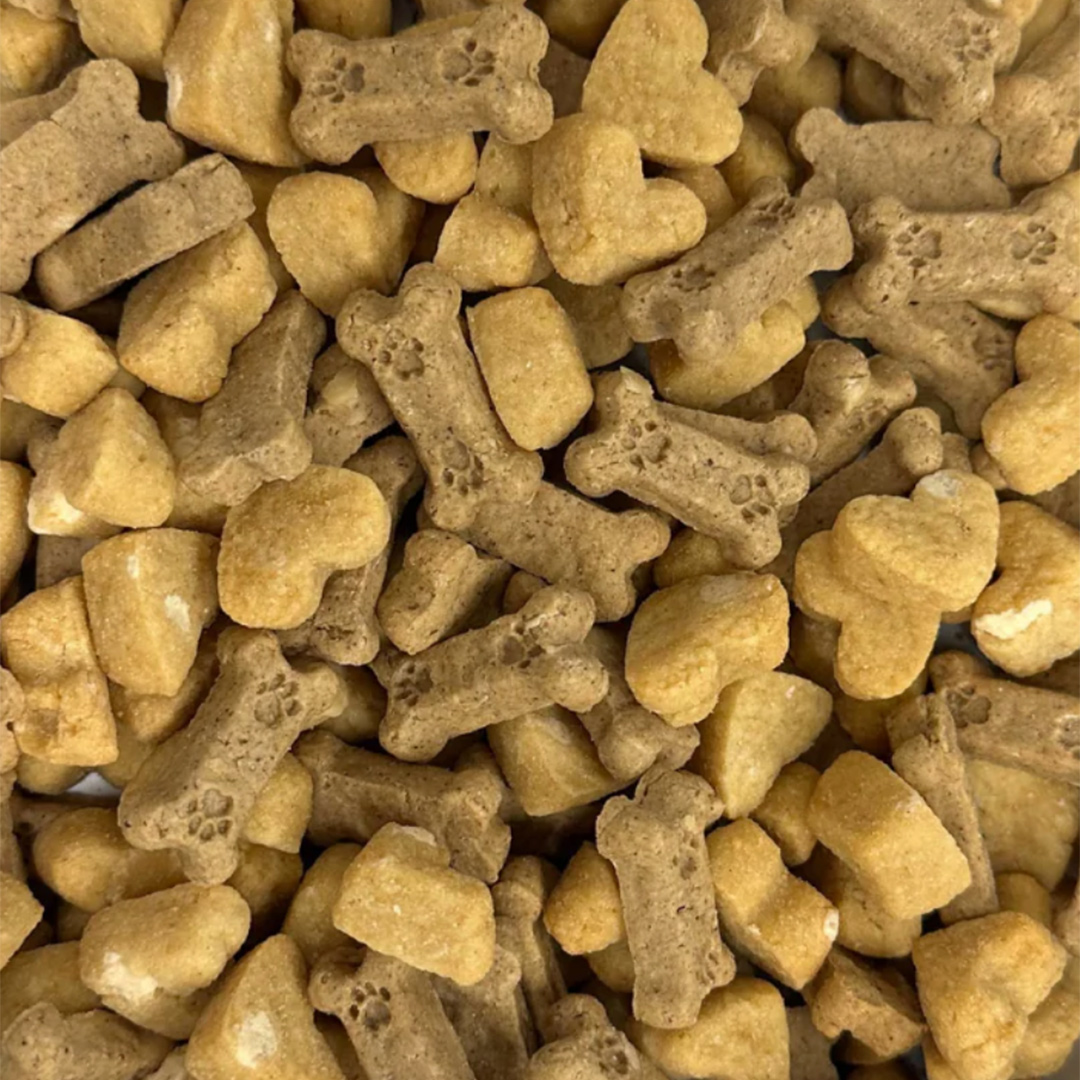 Crunchy Mini Bone Ingredients: Dried Bakery Product, Oat Flour, Wheat Flour, Applesauce, Rolled Oats, Canola Oil, Apple Fiber Pomace, Whole Egg, Cinnamon, Dried Bacillus Coagulans Fermentation Product.
