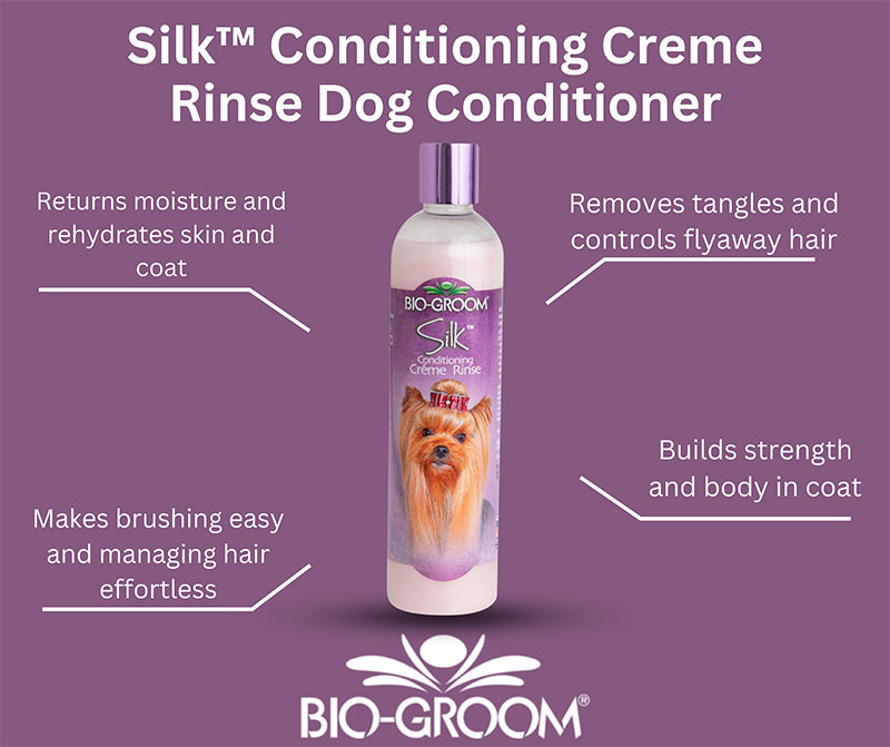 Our Silk™ Conditioning Crème Rinse returns moisture to your dog’s skin and coat, while removing tangles and controlling flyaway hair. Rinses out film free and makes hair incredibly easy to manage. Our formula is designed to build strength and body for your pup’s coat and was specially developed as a natural option in crème rinse dog conditioners.