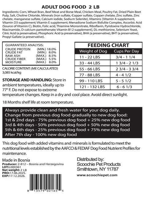Chewka Dry Dog Food in the 2 lb trial-size bag offers the same delicious chicken and beef protein recipe trusted by pet owners, now in a compact and convenient format. Formulated with two animal proteins, whole grains, and fortified with essential vitamins and minerals, this recipe supports optimal digestion, a shiny coat, and complete adult maintenance nutrition.