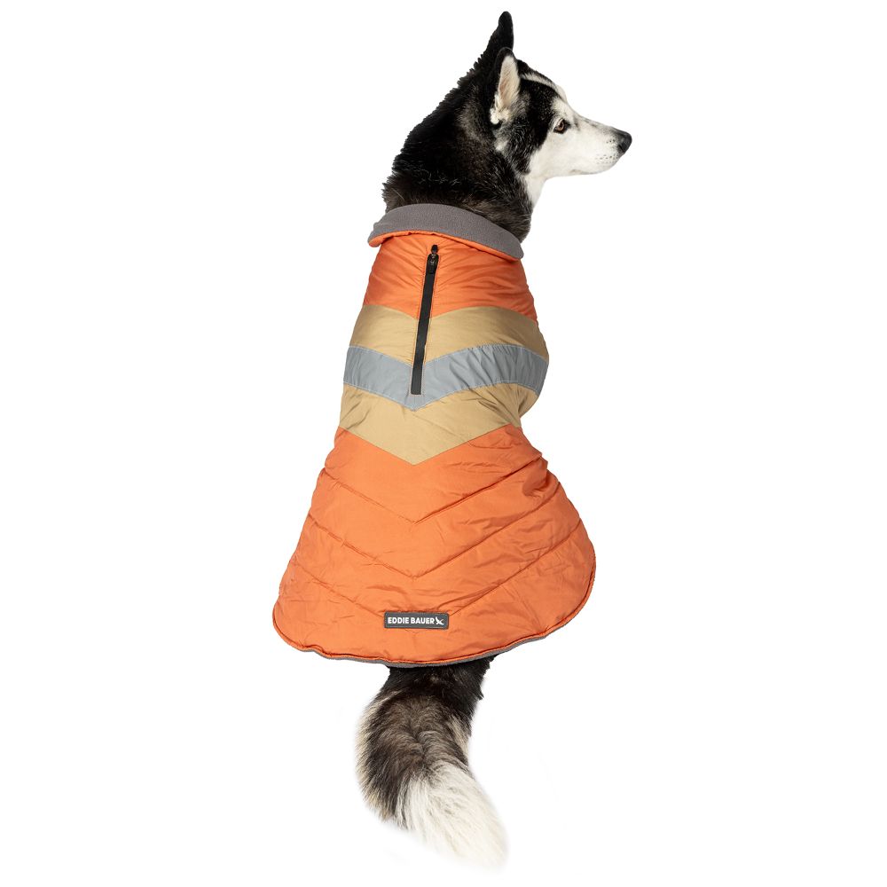 Waterproof polyester shell, fleece lining, polyfill insulation, reflective chevron pattern, harness zipper, and hook-and-loop straps at the neck and belly....