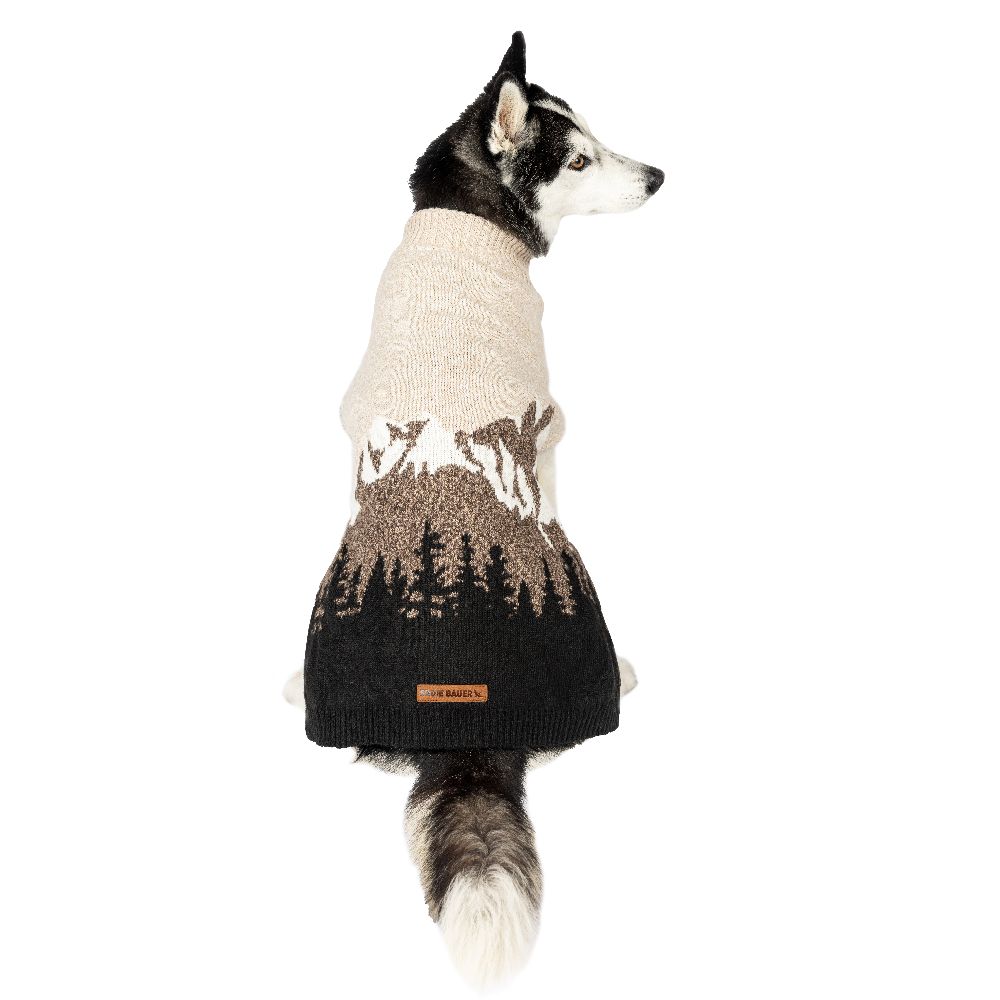 Soft, warm sweater with a heathered mountain landscape design. Ribbed trim, leash opening, and European belly cut. Light Brown/Gray, XS-XL