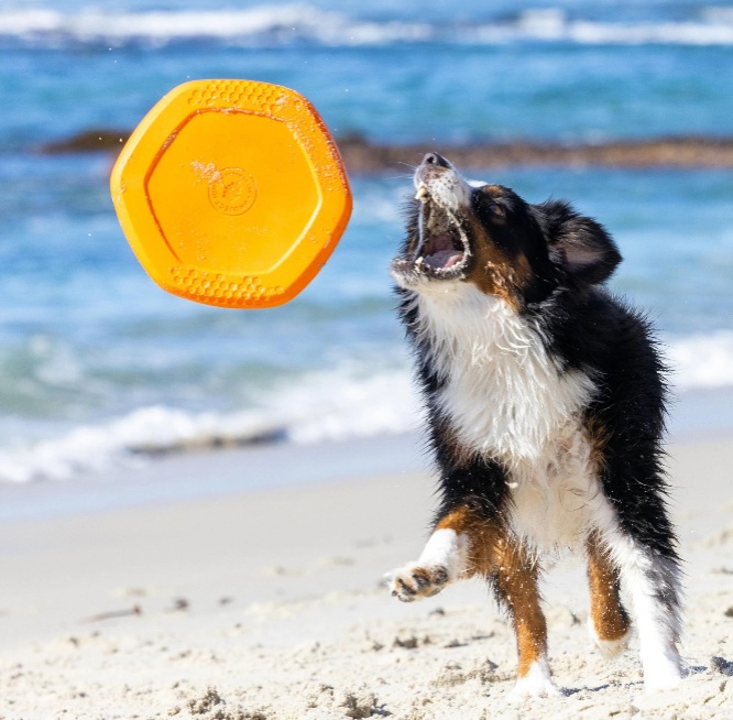 Our mango-scented Hive Disc will be your dog’s new favorite flyer! Made in the USA, the Hive Disc’s superb glide makes it perfect for dogs who love retrieving games. Its soft and flexible material is gentle on dogs’ teeth and gums. The Disc's bright color makes it easy for you and your dog to find indoors and outdoors. And if your pup loves the water, the Hive Disc floats for refreshing games of fetch in the lake or pool!