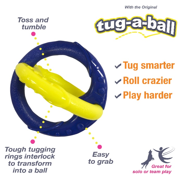 Power up playtime with Power Play Dog Toys from Nylabone! Play engineered for your furry MVP, the transformative Tug-a-Ball combines multiple play patterns for a never-before-seen interactive dog toy. Use the durable rings on this 2-in-1 toy for thrilling dog tug of war games or lock them into place to create an exciting ball that rolls and bounces unpredictably. Designed in colors that are highly visible to our four-legged friends, this blue and yellow dog toy will capture your pup's attention and keep them entertained for hours. Plus, it's perfect for solo or team play and keeps dogs occupied indoors or outdoors. Tug smarter, roll crazier, and play harder with the original Tug-a-Ball dog toy! 2-IN-1 PLAY TOY FOR DOGS These toy rings lock together to form a bouncy ball, giving your dog 2 exciting ways to play|BOUNCE-AND-TUG ACTION You and your dog can tug these durable rings or turn them into a high-bouncing, crazy-rolling ball|PERFECT FOR SOLO OR TEAM PLAY You can enjoy this dog playing toy with your pup or let them have fun on their own|PLAY INDOORS OR OUTDOORS Use this toy on the lawn, in your home, and beyond! br/>Sold in Quantity of: 1