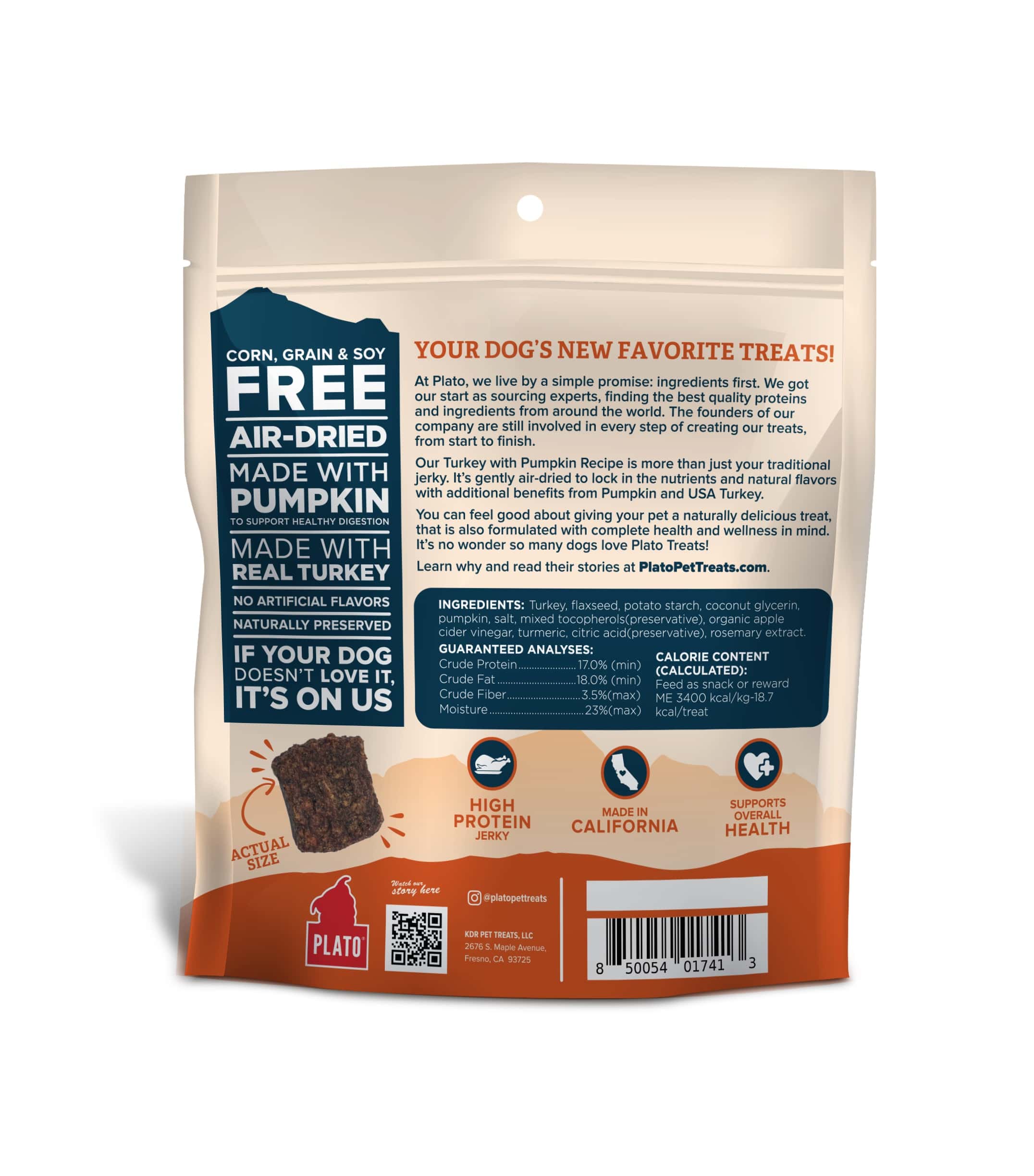 High-protein Turkey with Pumpkin Recipe is made with USA Turkey and Pumpkin to support your dog’s over health. These treats are gently air-dried to lock in the nutrients and natural flavors with additional benefits from Turkey, Pumpkin and flaxseed.