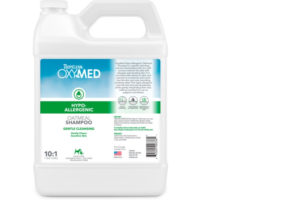 OxyMed Hypo-Allergenic Oatmeal Shampoo is a gentle cleansing solution formulated with our mild coconut cleanser for pets with allergies and sensitive skin.