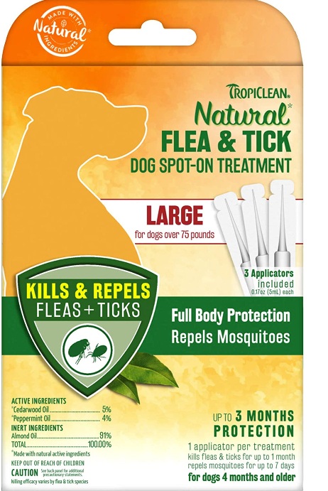 TropiClean Natural Flea & Tick Dog Spot-On Treatment for medium dogs is made with natural active ingredients, cedarwood and peppermint oils, and is safe when used as directed to protect and defend against those irritating fleas, ticks and mosquitoes. Our water resistant spot-on treatment is a full body repellent for dogs 35-75 pounds that effectively protects your furry friend. br/>Sold in Quantity of: 1
