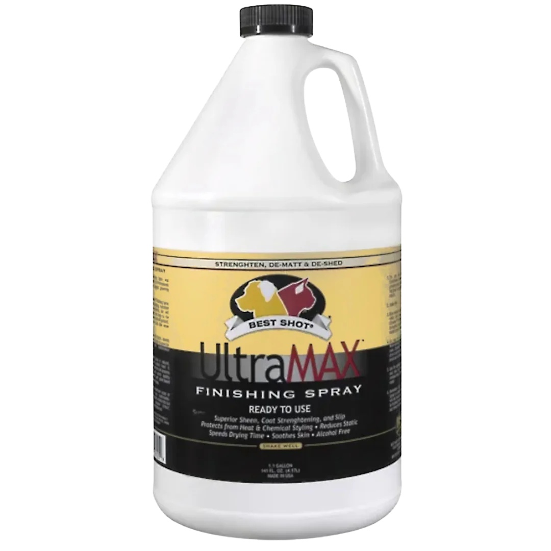 Best Shot UltraMAX Finishing Spray is a professional leave-in spray designed to hydrate, detangle and protect dogs’ coats while enhancing shine, flow and manageability.