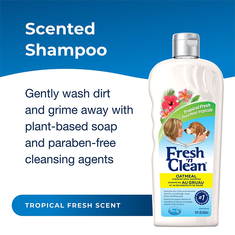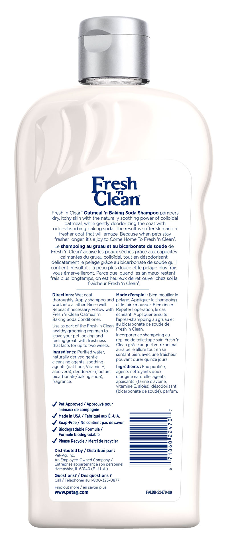 Bathe your dog in a blend of soothing oatmeal, baking soda and Aloe vera with Fresh ’n Clean® Oatmeal ’n Baking Soda Shampoo. The shampoo uses gentle, plant-based cleansing ingredients. This shampoo works into a deep, rich lather, washing away dirt and debris to leave the coat clean and refreshed while soothing the skin and controlling odor. And the Fresh ’n Clean signature, long-lasting scent keeps your dog smelling fresh up to two weeks.